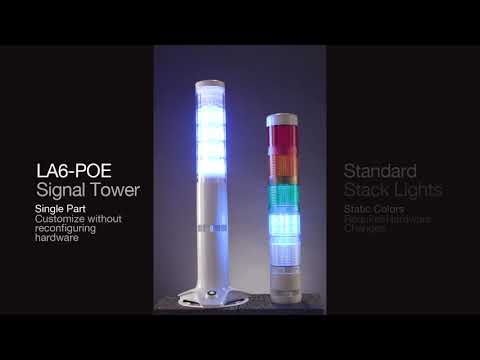 Die LA6-POE ist die erste programmierbare mehrfarbige 60mm-LED-Signalsäule mit Power-over-Ethernet-Unterstützung (PoE). Mit PoE steuern sie die Kommunikation und Stromversorgung mehrerer Signalsäulen über ein einziges Netzwerkkabel. Die LA6-POE unterstützt außerdem Modbus TCP/IP und HTTP/S Protokolle zur Integration in eine vorhandene Infrastruktur und Hardware Topologie. Durch die praktische Spiegelungsfunktion können Sie zudem den visuellen und akustischen Status auf bis zu 8 ortsferne LA6-POE Slave-Geräte spiegeln.